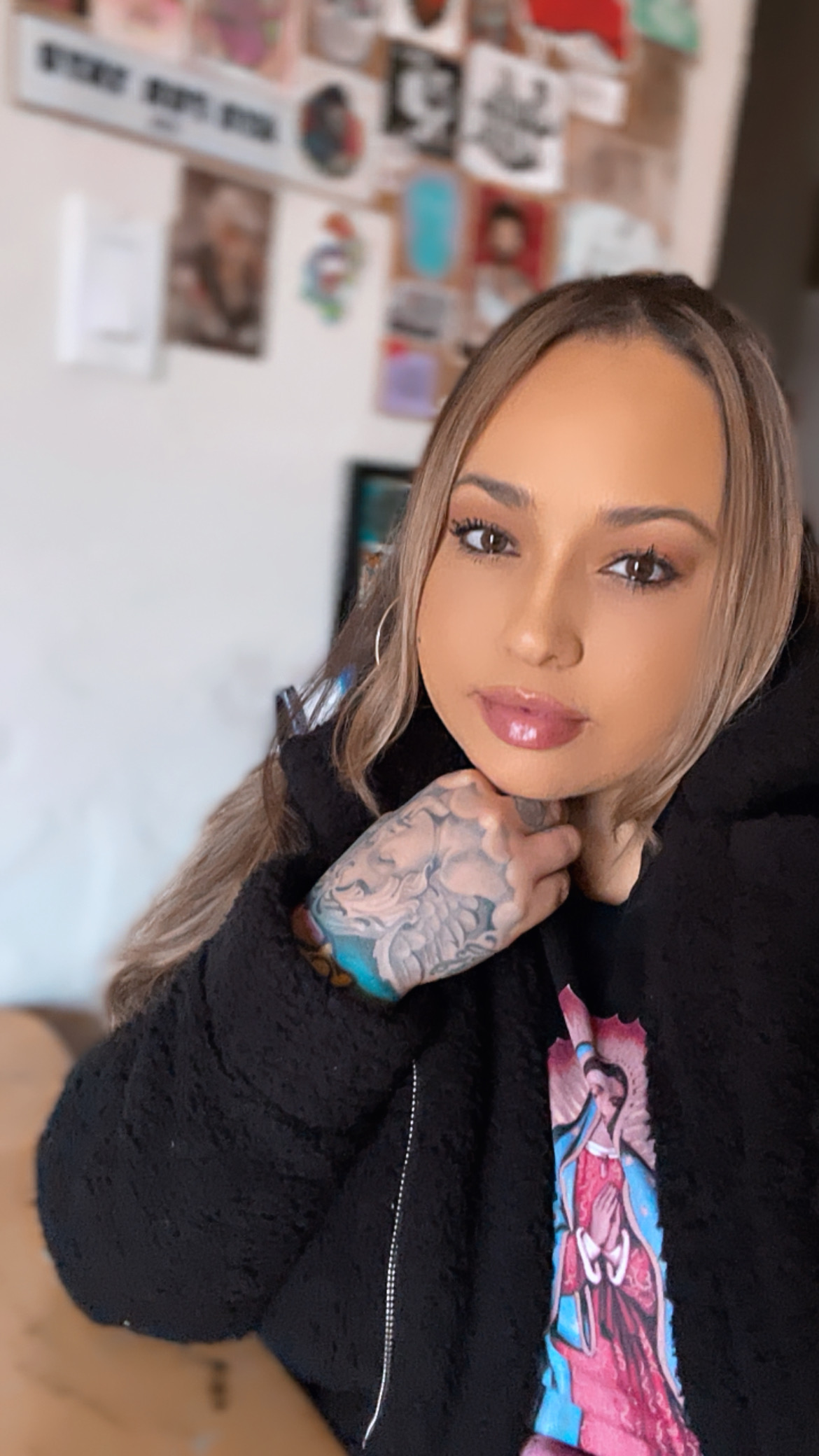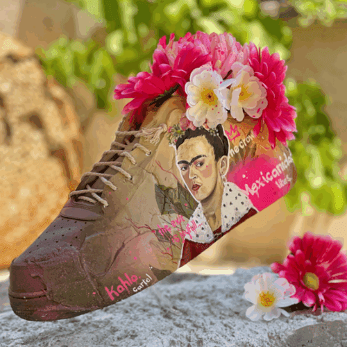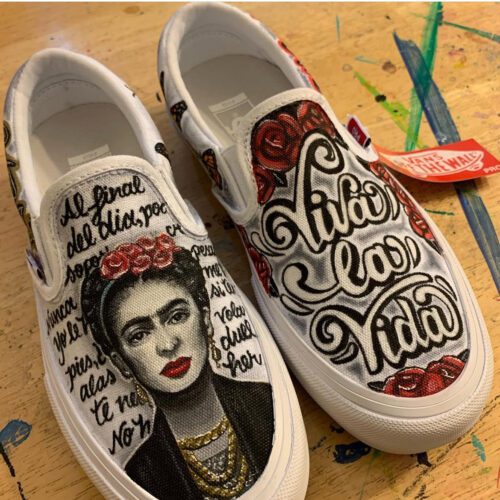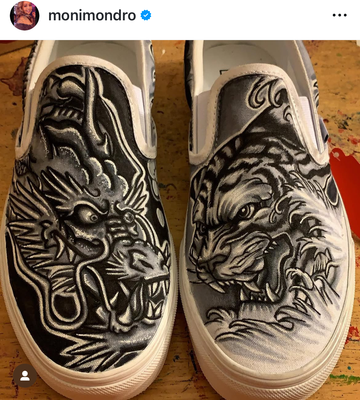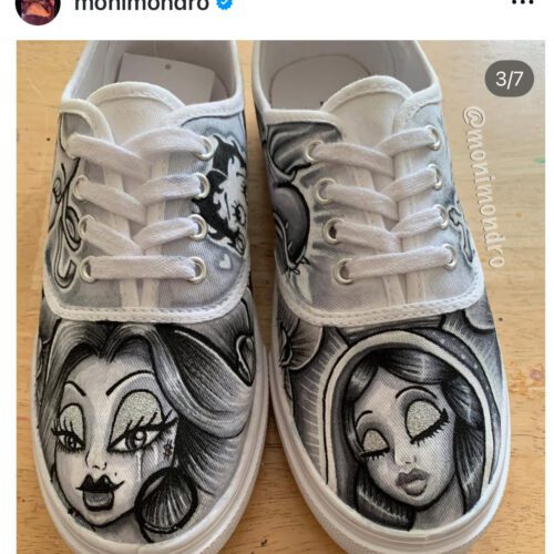 Monica Robledo, also known as Moni Mondro, is a Bay Area-based multimedia artist whose work bridges tattoo culture, lowrider art, and contemporary urban expression. Inspired by classic black-and-grey techniques, vibrant street energy, and nostalgic cartoons, she transforms everyday objects—like shoes—into canvases that tell stories. Each piece reflects her deep connection to culture and the beauty of individuality.