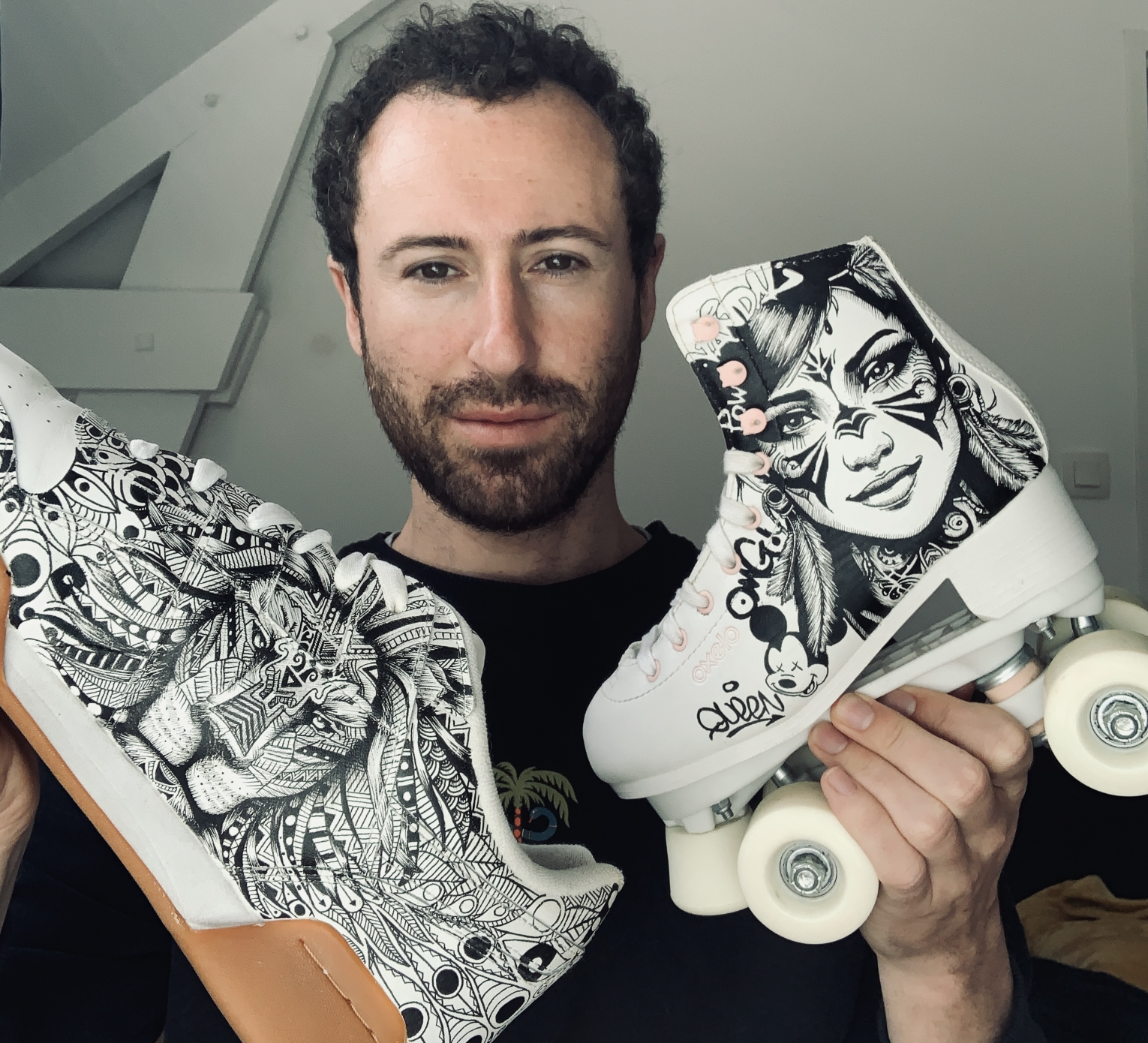Salut! I’m Guillaume, known as Guitho Custom, a French artist who works only in black and white. I’m 34 and from Rennes. Though I studied Environmental Engineering, my real passion has always been drawing. During my travels with my wife, I carried a sketchbook everywhere. In New Zealand, I met a custom artist who taught me the basics, and that’s where my journey began. Later, while living in Réunion Island, I started my sneaker customisation business in 2021. I was one of the first on the island, and it quickly took off. I love every step, from chatting with clients to creating designs and customising their shoes. My style focuses on fine black-and-white lines, using pens and even a tattoo machine for shading. Creating unique, wearable art that makes people smile is what drives me.